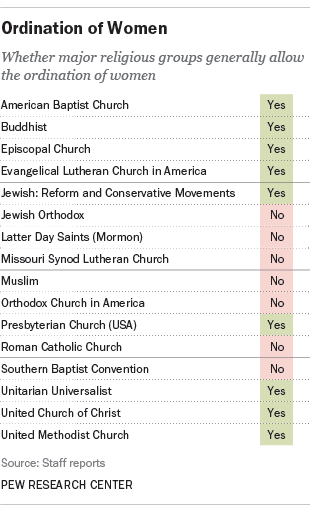 The above chart was published in a 2014 article written by David Masci. The chart lists who do and do not ordain women to preach for or lead congregations (2014). The American Baptist Church did (2014) but the Southern Baptist Convention (SBC) did not (2014). This one doctrinal issue (role of women) is not exhaustive in determining if a church is the New Testament church, but a church that ordains women cannot be the New Testament church.